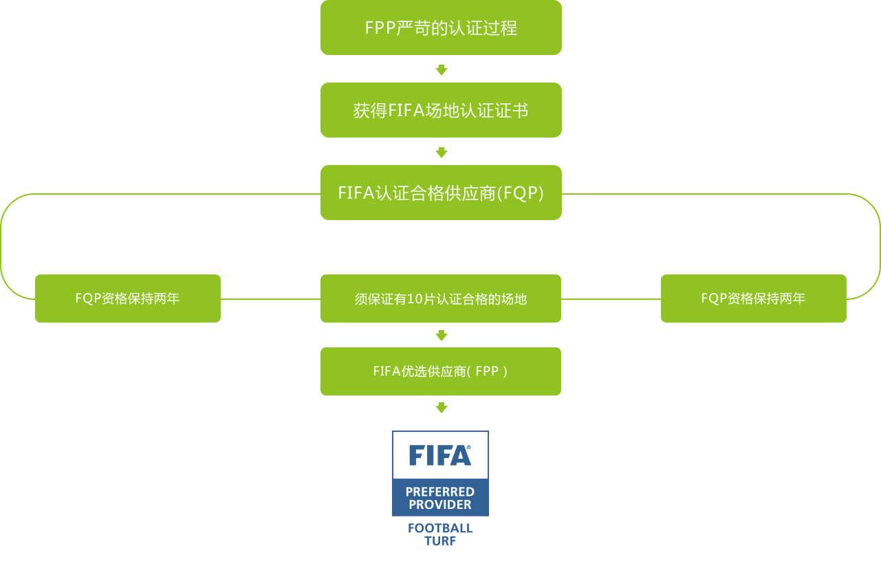 國際足聯(lián)于2009年首次提出FPP這一概念,以滿足市場(chǎng)對(duì)人造草坪產(chǎn)品及其鋪裝過程的更高質(zhì)量需求。FPP概念的提出,