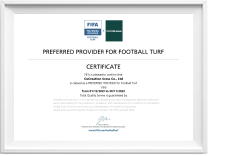 截至2020年,共創(chuàng)人造草獲得的FIFA場地認證證書數(shù)量已達到300片,在國內(nèi)處于領先地位。
