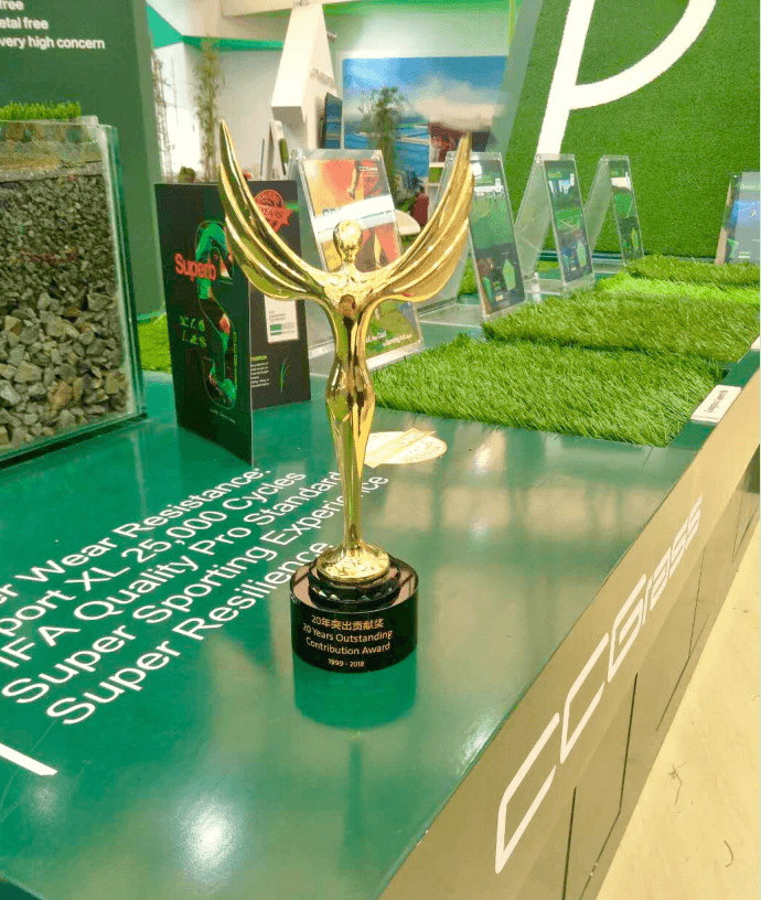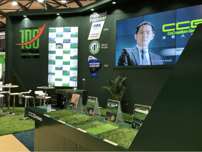 走進CCG共創(chuàng)人造草的展位,整體設(shè)計明亮大氣,高低錯落,兩大系列產(chǎn)品——運動型人造草坪和休閑型人造草坪展臺分列兩側(cè),詳細而清晰地展示了CCG產(chǎn)品的專業(yè)性。內(nèi)墻上懸掛的國際足聯(lián)FIFA、世界橄欖球聯(lián)合會WORLD RUGBY和國際曲棍球聯(lián)合會FIH三大世界級專業(yè)體育運動組織的選優(yōu)供應(yīng)商標志,吸引到諸多贊嘆的目光,這不僅反映出共創(chuàng)人造草的強大實力,更是中國企業(yè)在全球影響力不斷提升的一種體現(xiàn)。